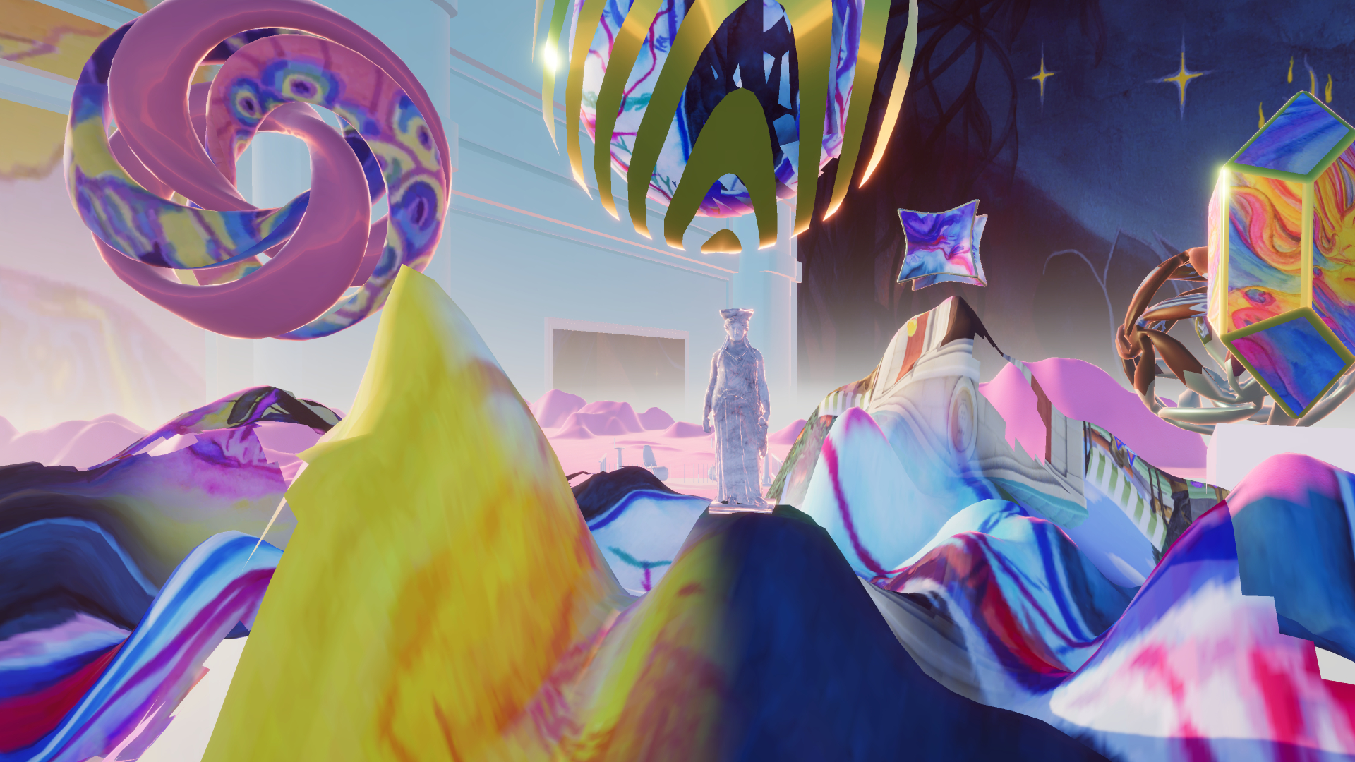 Following the logic of plundercore, the environment is built from modified free resources and recontextualized 3D models.